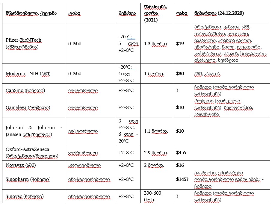 ხსენებული ვაქცინების ტიპებიდან ყველაზე ინოვაციური და დღემდე უცნობი - მ-რნმ ვაქცინებია. ხოლო ინაქტივირებული ვაქცინები ყველაზე ტრადიციული ტექნოლოგიაა. შესაბამისად, პირველებთან დაკავშირებით მოლოდინებიც მეტია და გაურკვევლობაც. მოლოდინები მნიშვნელოვანწილად უკვე გამართლდა - მოკლე დროში შემუშავებულ იქნა ორი მაღალეფექტური ვაქცინა,რომელიც ამჯერად ყველაზე მოთხოვნადია მსოფლიოში - პფაიზერ ბიონტექის აცრები უკვე დაიწყო ბრიტანეთსა და ამერიკაშიც.